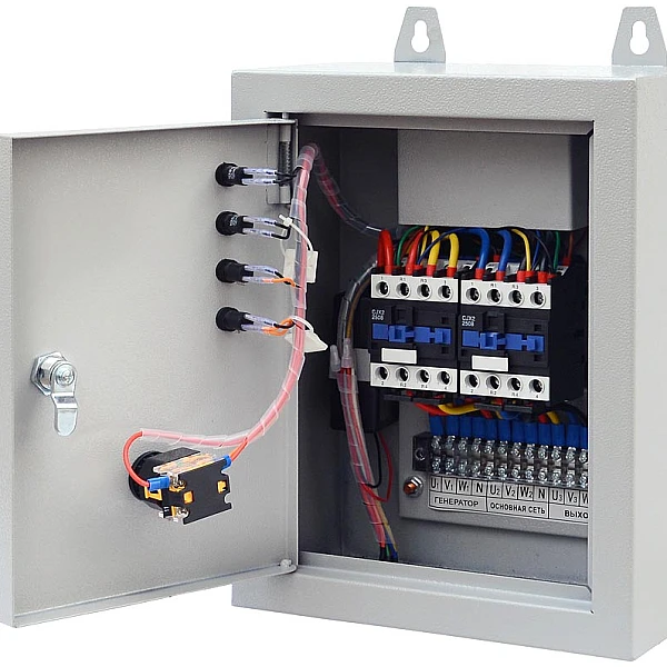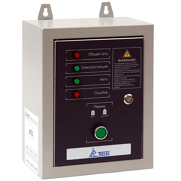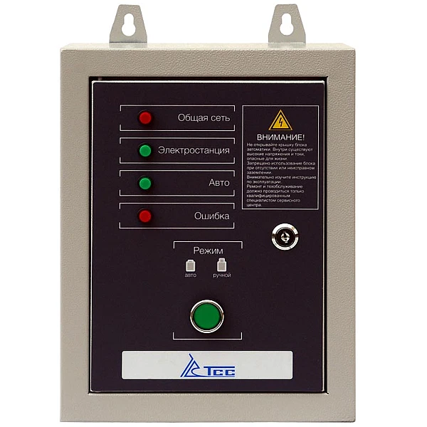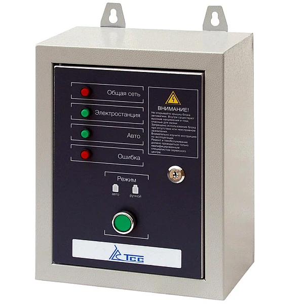 Блок АВР-С ТСС 10000/400 оборудован рядом контрольных ламп, которые наглядно отображают текущий статус и состояние электросети. Отдельный переключатель позволяет выбрать ручной или автоматический режим запуска генератора.