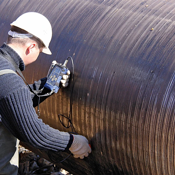 В приборе комбинируются магнитный и вихретоковый методы выявления дефектов, что обеспечивает контроль изделий с грубой, скоррогированной поверхностью и работу через слой изоляционного покрытия переменной толщины без дополнительных настроек.