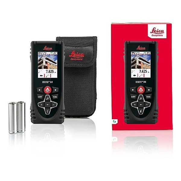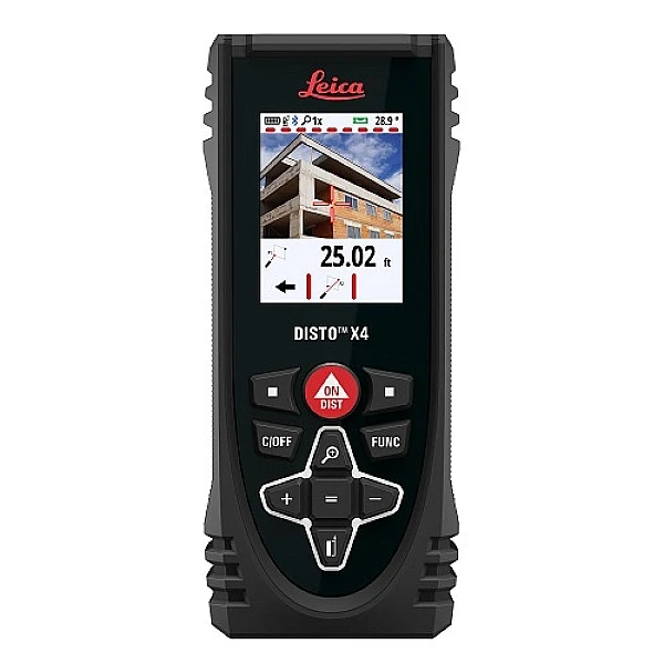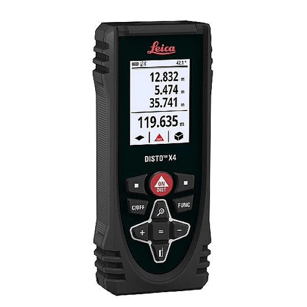 Прибор позволяет выполнять измерения на расстоянии от 50 мм до 150 м. Погрешность при определении расстояний не превышает 1 мм. Кроме того, дальномер Leica Disto X4 оснащен датчиком наклона. Благодаря ему можно выровнять дальномер и исключить погрешность при определении расстояния, а также вычислить высоту объекта на основе длин двух сторон треугольника и углу между ними.