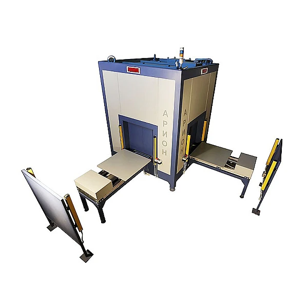 Камера радиационной защиты представляет собой каркасную конструкцию из свинца и стали с внутренним наполнением. Состоит из нескольких элементов: кабина радиационной защиты, штатив-манипулятор для рентгеновского аппарата, 2 загрузочных стола для объекта контроля, стойка управления, комплект защитных световых барьеров.