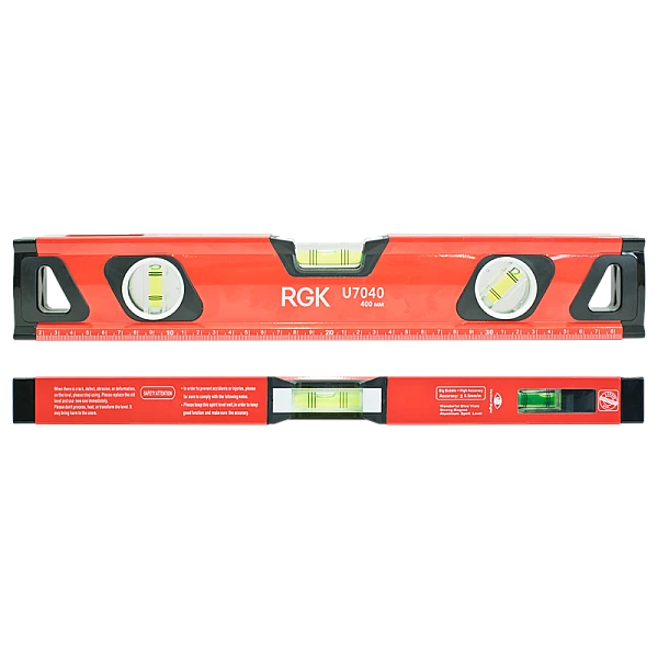 На узком верхнем ребре строительного уровня RGK U7040 находится окошко, в котором с помощью системы зеркал отображается положение пузырька вертикального уровня. Благодаря этому, удобно контролировать вертикальные поверхности в узких нишах и в прочих труднодоступных местах.