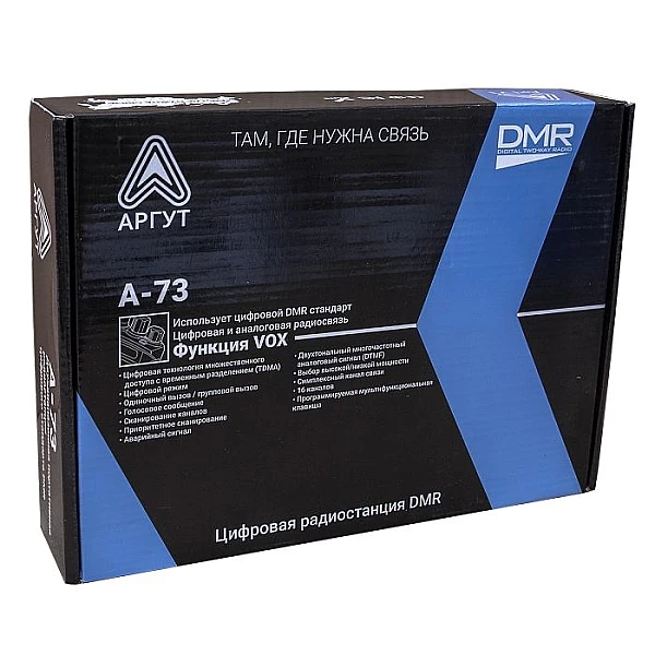 Цифровая радиостанция полупрофессионального класса. Работает в цифровом или в аналоговом режиме. Режим автоматического сканирования удобен при использовании Аргут А-73 в радиосети, где радиоретрансляторы работают на различных частотах. Цифровой канал защищён от помех, прослушивания и вмешательства в переговоры сторонних абонентов. В комплекте дополнительно малогабаритная антенна для скрытого ношения радиостанции.