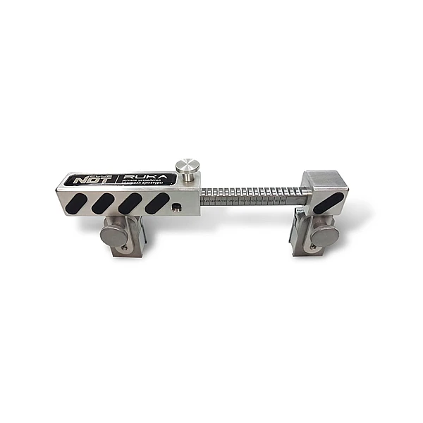 RUKA ручное устройство контроля арматуры - предназначено для ручного ультразвукового контроля стыковых однорядных соединений стержней арматуры диаметром от 20 до 40 мм, выполненных ванными и многослойными способами сварки в инвентарных формах, на стальных скобах-накладках и подкладках или без формующих и вспомогательных элементов. Устройство применяется в составе с ультразвуковым высокочастотным дефектоскопом общего назначения, позволяющим работать по раздельной схеме подключения ультразвуковых пьезоэлектрических преобразователей (ПЭП).
