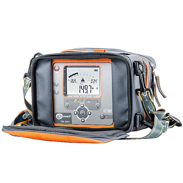 TM-2501 — цифровой мегаомметр, предназначенный для измерения сопротивления изоляции кабельных линий, проводов, обмоток трансформаторов, двигателей, других электро- и телекоммуникационных установок. Максимальное измерительное напряжение составляет 2500 В постоянного тока, а диапазон измеряемого сопротивления ограничен величиной в 1000 ГОм. Установка трех интервалов времени позволяет автоматически рассчитывать коэффициенты абсорбции (увлажненности) и поляризации (старения). В процессе измерения сопротивления изоляции прибор отображает величину тока утечки.