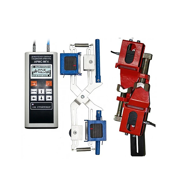 Дефектоскоп АРМС-МГ4 предназначен для контроля качества сварных стыковых соединений стержневой арматуры диаметром от 16 до 40 мм в соответствии с ГОСТ 23858, СТО 02495307-002-2008 при монтаже сборных и возведении монолитных ж/б конструкций теневым и зеркально-теневым методами. Для проведения контроля сварных соединий используются механическое устройство в соответствии с ГОСТ 23858 (приложение 1) "Клещи" или приспособление "Струбцина". Механическое устройство типа «Струбцина» предназначено для использования в случаях, когда требуется очень надежное крепление преобразователей на арматуре. Ультразвуковой контроль зеркально-теневым методом с применением механического приспособления типа "Скоба" в соответствии с СТО 02495307 применяется для сварных соединений, выполненных на стальных скобах-накладках там, где доступ с помощью приспособлений типа "Клещи" или "Струбцина" затруднен.