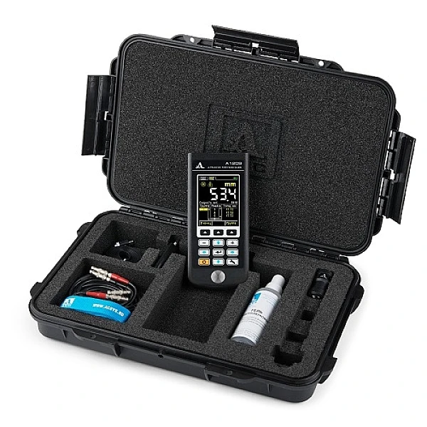 Ультразвуковой толщиномер А1209 предназначен для измерения толщины стенок труб, котлов, сосудов, обшивок судов, литья, листового проката и других изделий из чёрных и цветных металлов с гладкими или грубыми и корродированными поверхностями. Поддерживает работу со всей линейкой раздельно-совмещенных преобразователей в диапазоне от 4 до 10,0 МГц. Имеет встроенную память на 50 000 измерений.