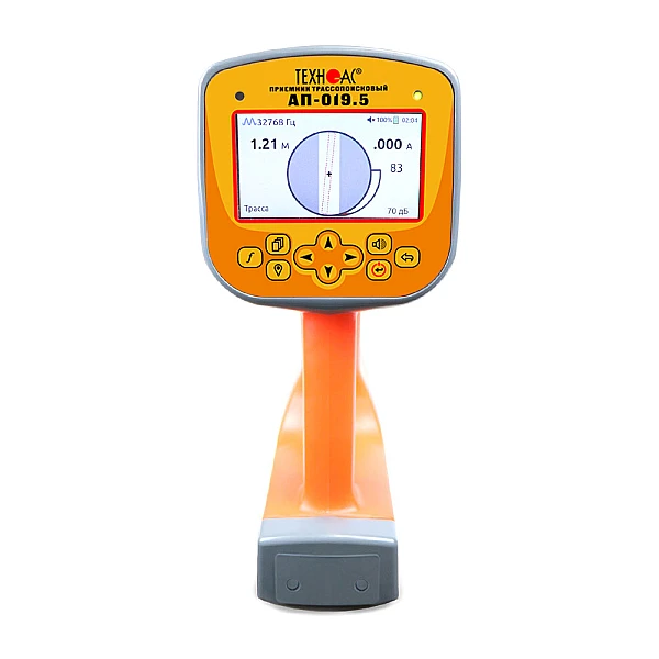 Кабелеискатель с цветным экраном и функцией сохранения GPS/ГЛОНАСС координат Успех 5Д. Приемник с функцией сохранения GPS/ГЛОНАСС координат в виде моноблока с отображением на графическом цветном ЖК дисплее линии положения коммуникации, графиков и шкал изменения уровней входных сигналов, цифровых значений уровней сигнала, расстояния до оси коммуникации, величины протекающего по ней тока и других параметров с диапазоном температуры эксплуатации от -30 до +50°С.